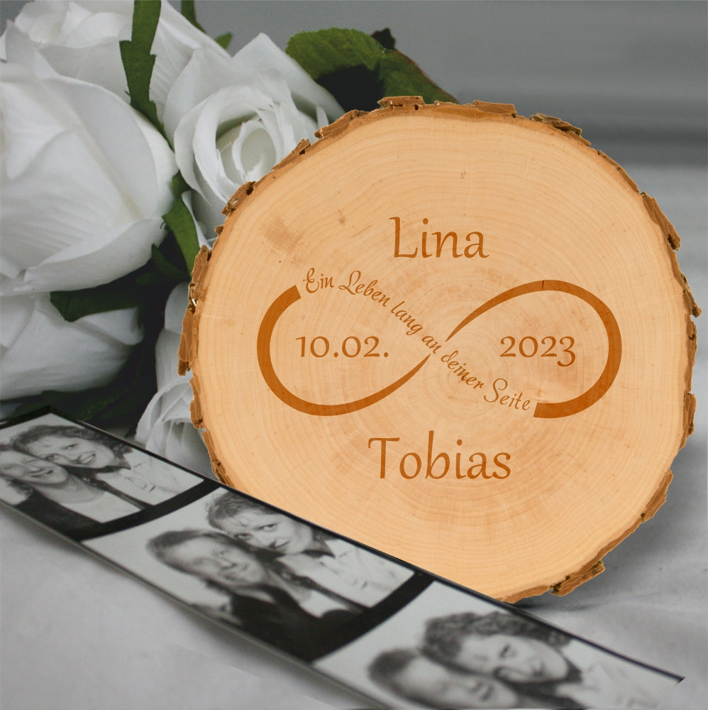 Baumscheibe „Unendlichkeitszeichen“ – personalisiert. Cooles Geschenk: Diese personalisierte Baumscheibe ist ein wirklich ausgefallenes Hochzeitsgeschenk für zwei Verliebte. Eine kreative Alternative zur klassischen Karte.. Unendliche Liebe: Ein Unendlichkeitszeichen, zwei Namen, ein Wunschdatum und der Spruch „Ein Leben lang an deiner Seite“ veredeln dieses tolle Geschenk!. Hübsches Wohnaccessoire: Dieser geniale Liebesgruß ist zugleich ein hübsches Wohnaccessoire. Ein echter Blickfang für jeden Wohnraum, der Eindruck hinterlässt.. Perfektes Hochzeitsgeschenk: Ob zum Valentinstag, Jahrestag, oder zur Hochzeit – diese Baumscheibe ist ein geniales Geschenk für Verliebte oder Freunde die heiraten!. Hochwertige Gravur: Durch die persönliche Gravur auf der beidseitig geschliffenen Baumscheibe verwandeln wir dieses Geschenk für dich in ein einzigartiges Unikat.. ❤️ Baumscheibe „Unendlichkeitszeichen“ romantisches Geschenk. Du bist auf der Suche nach einem ganz besonderen Geschenk für deinen