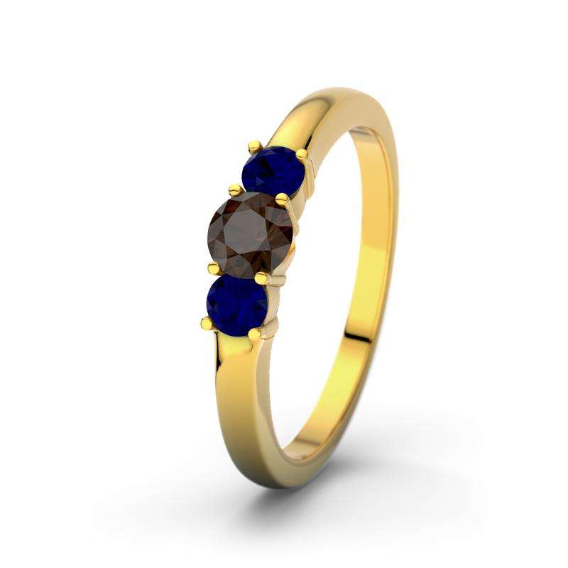Blaue Saphire, wie Kate Middleton sie trägt, variieren je nach ihrem Fundort von Königs- und Kornblumenblau bis hin zu dunklem Samtblau. Unsere blauen Saphire beziehen wir in +Qualität aus Thailand und Indien. Der Rauchquarz ist bekannt für seine dunkle, durchscheinende Farbe, welche von weichem Gelbbraun, Schokoladenbraun bis hin zu schwärzlichem Holzkohlenbraun variiert. Er gehört zu den sensiblen Steinen, weshalb es empfehlenswert ist, direktes Sonnenlicht zu meiden und ihn gelegentlich mit einem Baumwolltuch zu polieren. Unser Gelbgold 585 (14kt) besteht aus 58,5% Gold, 30,0% Silber und 11,5% Kupfer. Ein sehr beliebtes Edelmetall, besonders für Verlobungs- und Eheringe.