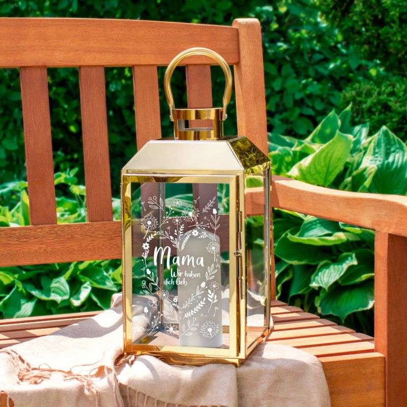 Gold Laterne für Mama – Windlicht mit Blumenherz Gravur