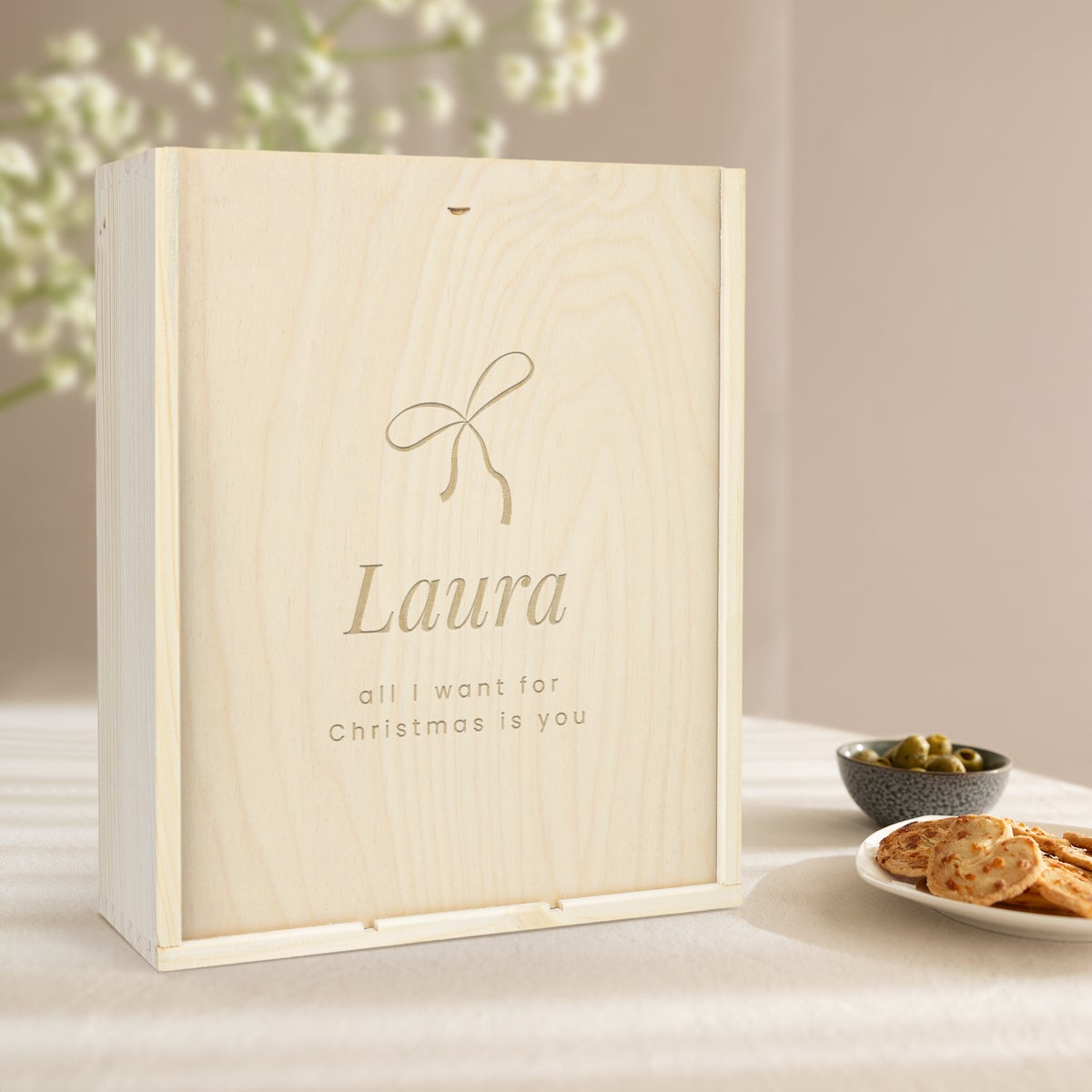 Eine edle Holzkiste mit persönlicher Gravur und Platz für eine Flasche und 2 WeingläserSind Ihre Eltern echte Weinkenner? Ihr bester Freund trinkt gelegentlich gerne ein Glas Wein? Vielleicht haben Sie einen wichtigen Moment, auf den Sie anstoßen möchten? Dann ist diese luxuriöse Holzkiste das perfekte Geschenk! Gestalten Sie den Deckel selbst, indem Sie einen Namen oder Text hinzufügen. So können Sie eine einzigartige und persönliche Überraschung zum Geburtstag, Vatertag, zu den Feiertagen oder einem Jubiläum schaffen. Auch perfekt geeignet, um jemandem zu danken oder zu gratulieren. Die Deluxe-Holzkiste ist aus nachhaltigem Holz mit dem FSC-Siegel gefertigt, sodass Sie zu einer nachhaltigen und verantwortungsvollen Waldbewirtschaftung beitragen können. Das Set enthält eine stilvolle Samteinlage mit Platz für eine Flasche Wein und 2 Weingläser. Es ist ganz einfach, Ihre eigene gravierte Holzkiste zu entwerfen! Fügen Sie in unserem Editor einen Namen oder Text Ihrer Wahl hinzu oder entscheiden Sie sich für ein besonderes Datum oder ein cooles Zitat. Wir gravieren Ihr Design dann mit großer Sorgfalt und Präzision in den Deckel. Gestalten Sie jetzt Ihre personalisierte Holzkiste, bereit für den Champagner Ihrer Wahl! Möchten Sie Holzkisten mit Ihrem Logo gravieren? Kontaktieren Sie für größere Mengen unsere Handelsabteilung.