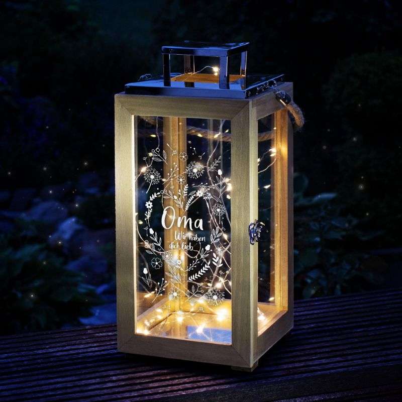 Holzlaterne für Oma – Windlicht mit Blumenherz Gravur