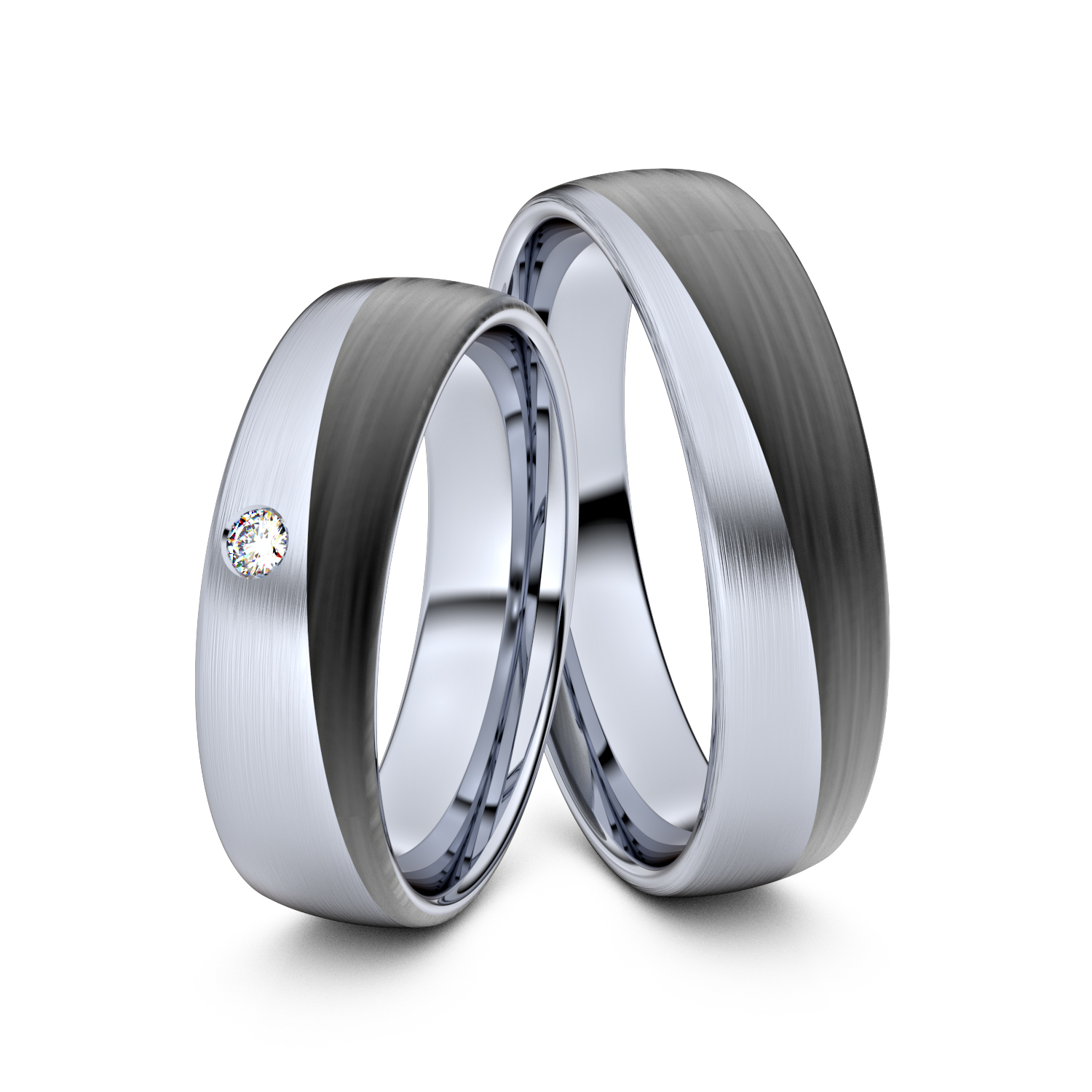 „Das Material ist aus 950er platin-carbon. Im Damenring finden wir einen Steinbesatz mit 1×0.03ct. Die Oberfläche ist auf Wunsch poliert oder mattiert. Die Breite beträgt 5.5mm und die Stärke beträgt 1.6mm. Alle Ringe werden in unserer eigenen Manufaktur hergestellt und innherhalb von 6-15 Tagen an Sie versendet.“