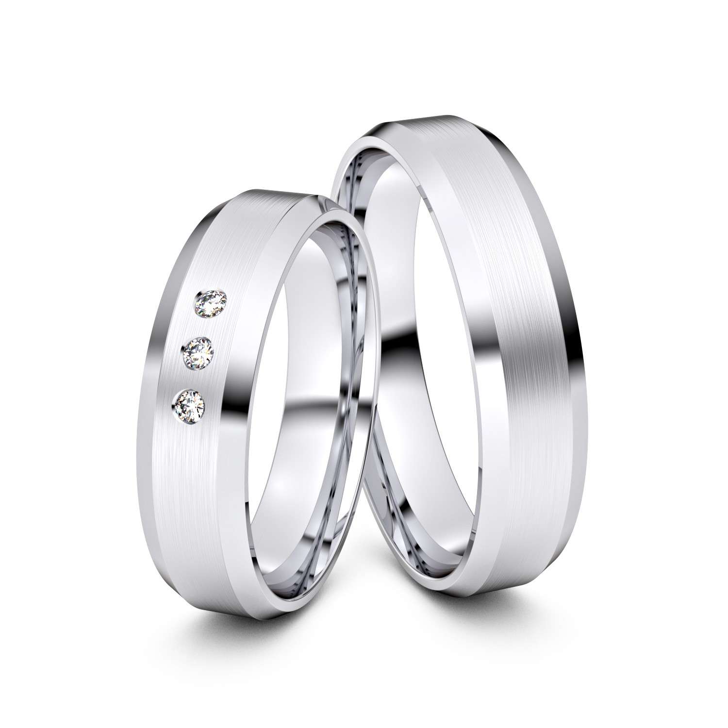 „Das Material ist aus 333er weissgold. Im Damenring finden wir einen Steinbesatz mit 3×0.01ct. Die Oberfläche ist auf Wunsch poliert oder mattiert. Die Breite beträgt 5mm und die Stärke beträgt 1.6mm. Alle Ringe werden in unserer eigenen Manufaktur hergestellt und innherhalb von 6-15 Tagen an Sie versendet.“