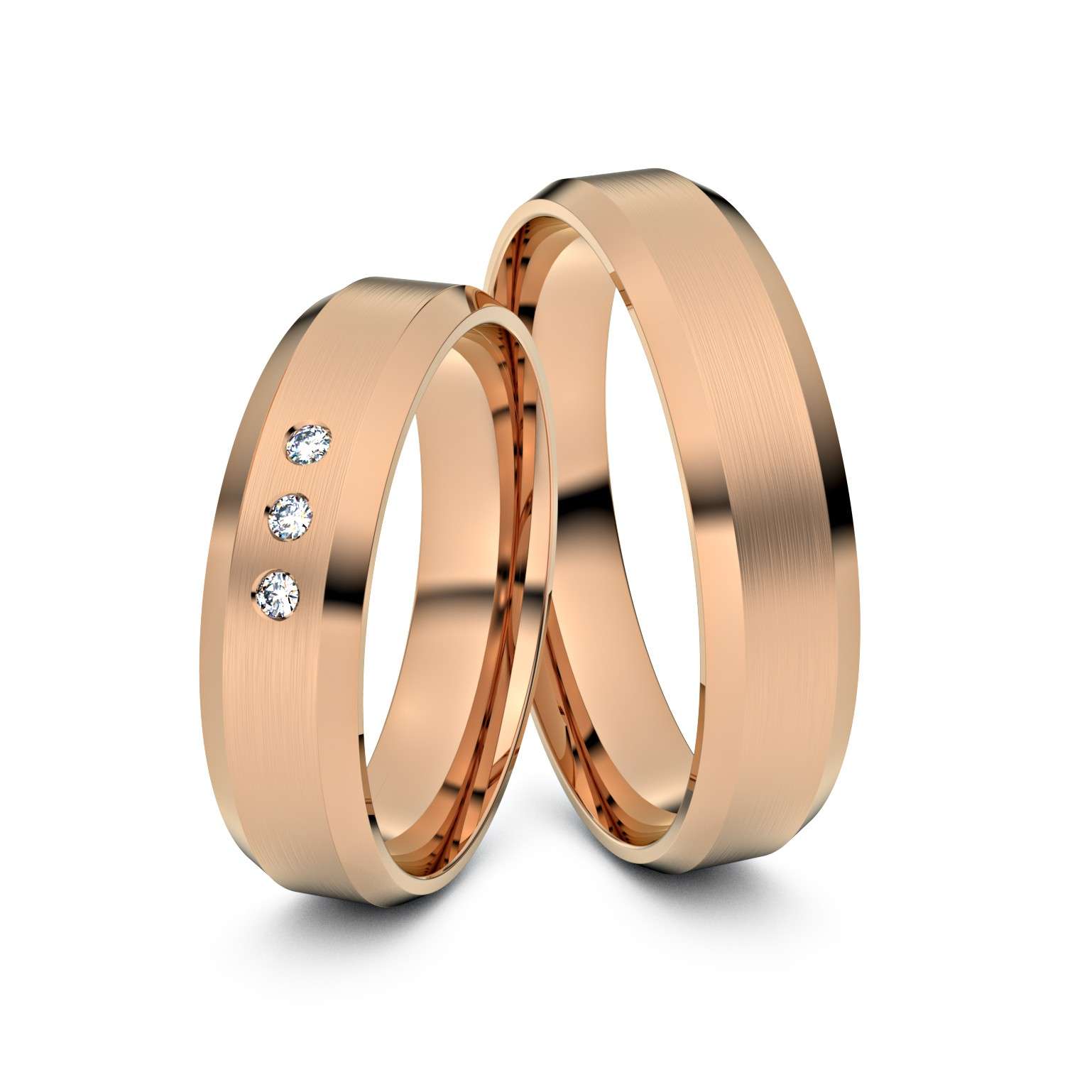 „Das Material ist aus 585er rotgold. Im Damenring finden wir einen Steinbesatz mit 3×0.01ct. Die Oberfläche ist auf Wunsch poliert oder mattiert. Die Breite beträgt 5mm und die Stärke beträgt 1.6mm. Alle Ringe werden in unserer eigenen Manufaktur hergestellt und innherhalb von 6-15 Tagen an Sie versendet.“
