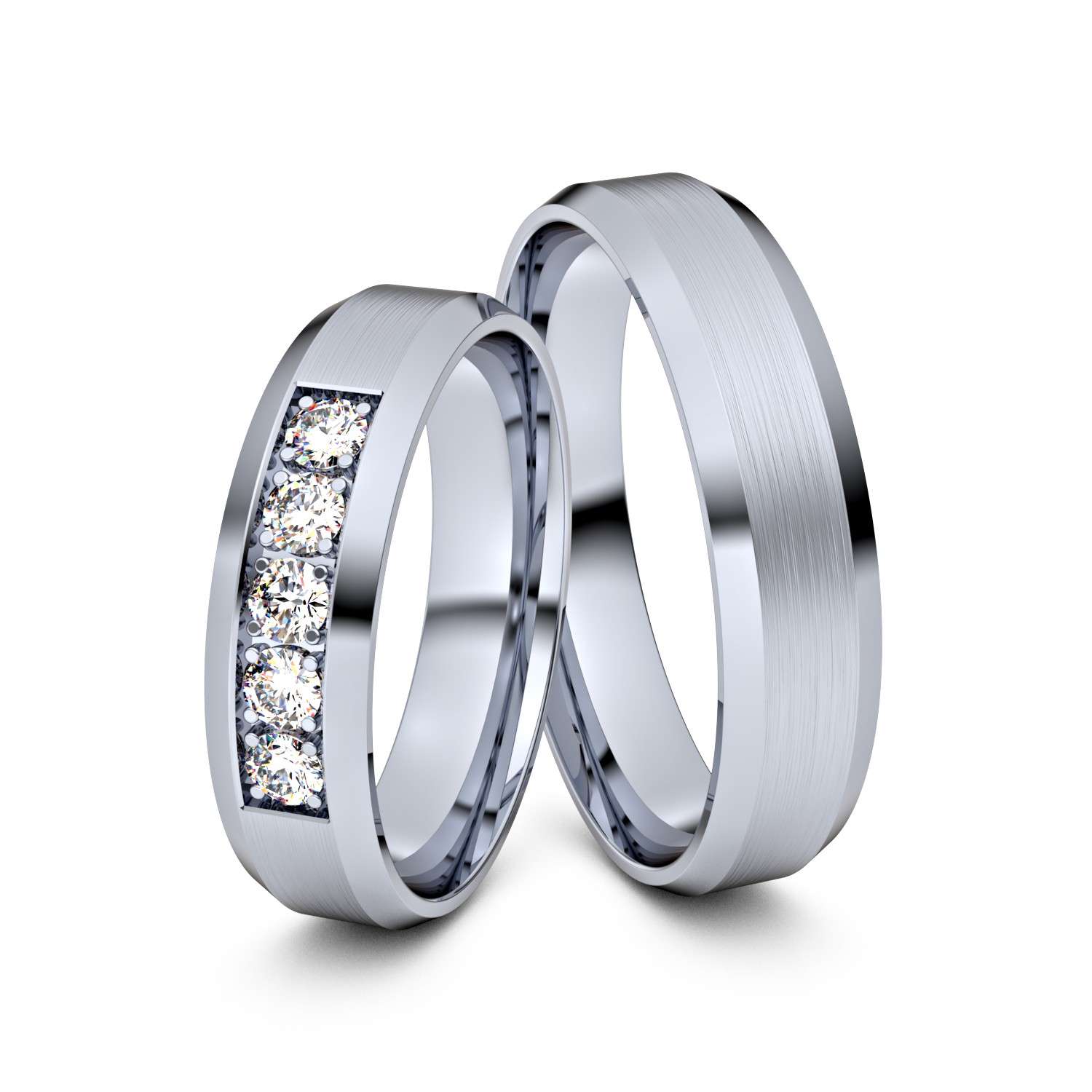 „Das Material ist aus 600er platin. Im Damenring finden wir einen Steinbesatz mit 5×0.05ct. Die Oberfläche ist auf Wunsch poliert oder mattiert. Die Breite beträgt 5mm und die Stärke beträgt 1.6mm. Alle Ringe werden in unserer eigenen Manufaktur hergestellt und innherhalb von 6-15 Tagen an Sie versendet.“