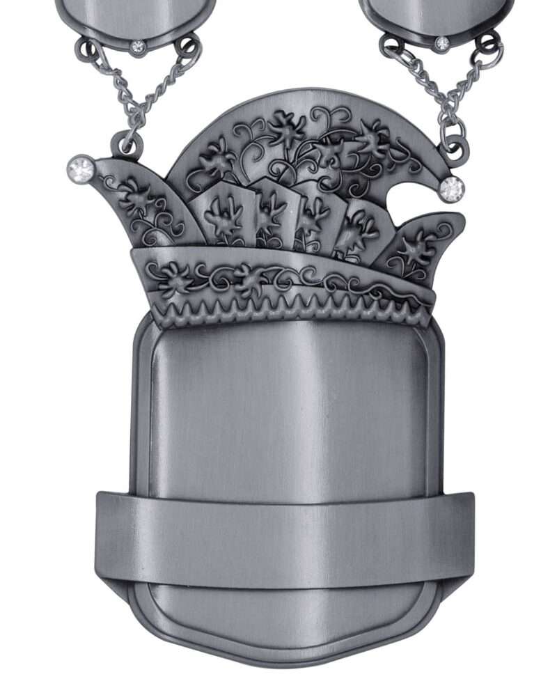 Prinzenkette "Leto"120mm x 88mm großes Schild mit Narrenkappe, Gravurfläche und Schmucksteinen10 kleine Kettenschilder 37mm x 34,5mm mit Gravurfläche und Schmucksteinen +8 kleine Narrenkappen 29mm x 49,5mm mit SchmuckteinenGesamtlänge ca. 90 cmKette in komplett gold, altgold oder altsilber