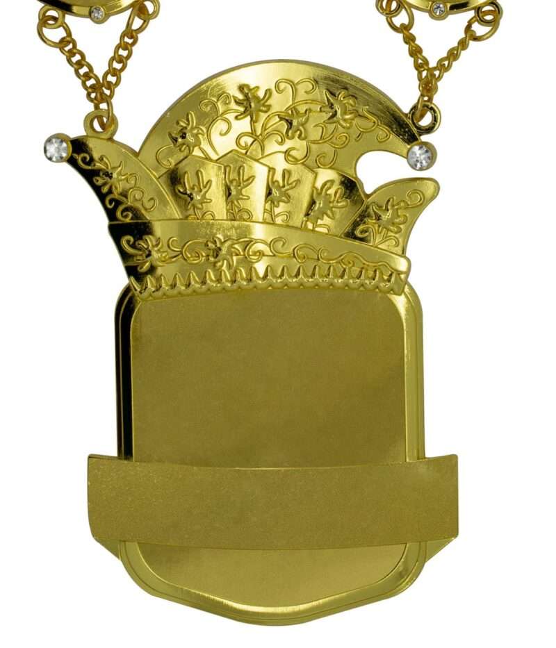 Prinzenkette "Leto"120mm x 88mm großes Schild mit Narrenkappe, Gravurfläche und Schmucksteinen10 kleine Kettenschilder 37mm x 34,5mm mit Gravurfläche und Schmucksteinen +8 kleine Narrenkappen 29mm x 49,5mm mit SchmuckteinenGesamtlänge ca. 90 cmKette in komplett gold, altgold oder altsilber