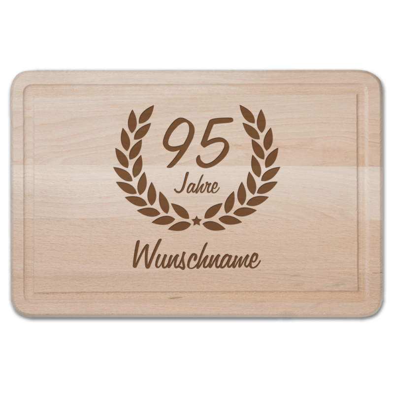 Tolles Schneidebrett mit Gravur zum 95. Geburtstag – Ehrenranke Das schöne Schneidebrett besteht aus massivem Buchenholz und besitzt eine praktische Ablaufrinne. Die schöne Maserung gibt dem Schneidebrett eine besondere Optik. Die Ehrenranke wird wie dargestellt graviert, Sie Jahreszahl gravieren wir ebenfalls so mit. Die Schriftart sowie die Anordnung übernehmen wir ebenso aus dem Beispiel. Den Namen des „Geburtstagskindes“ tauschen wir selbstverständlich wunschgemäß aus. Das Brettchen wird mit einer modernen Lasergravur gefertigt. Gegen Aufpreis kann eine Rückseitengravur bestellt werden. Hier kannst du eine liebe Widmung hinterlassen. ;.) Viel Spaß beim Bestellen und Verschenken!!! Maße: ca. 400 x 300…