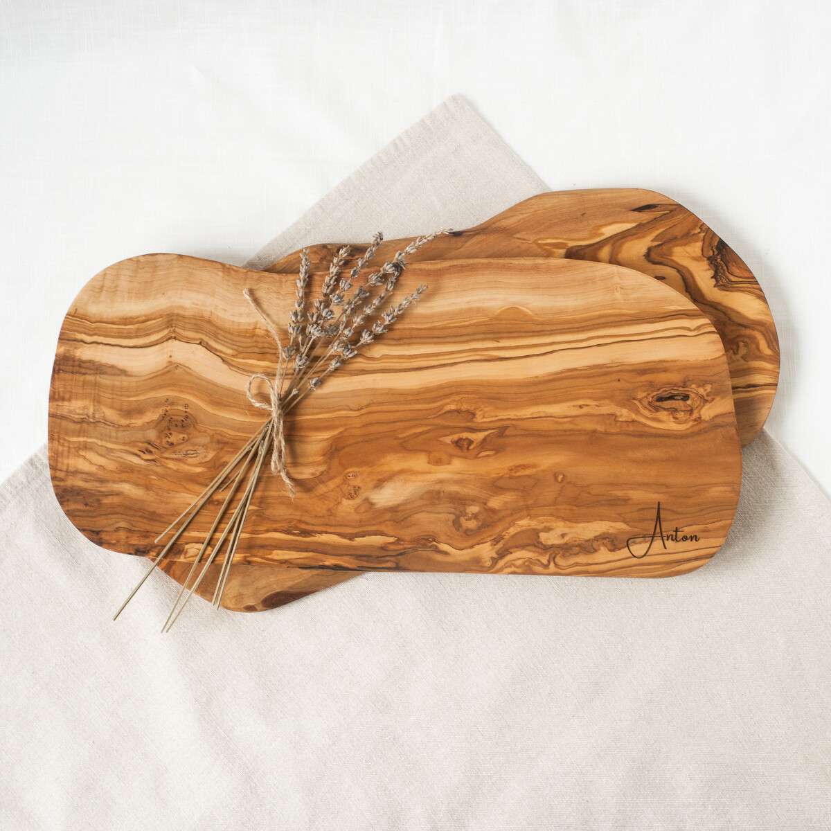 Schneidebrett aus Olivenholz Mit personalisierbarem Wunschtext und Motiv Unser Schneidebrett aus einzigartigem Olivenholz wird durch Handarbeit zu einem Unikat. Mit der Möglichkeit, einen individuellen Text sowie ein persönliches Motiv gravieren zu lassen, wird es zu einem besonders edlen Küchenaccessoire! ✔ PERSÖNLICHES GESCHENK: Verschenke ein ganz besonderes Schneidebrett mit individueller Gravur – perfekt für Geburtstage, Hochzeiten oder Einweihungsfeiern. ✔ JEDES BRETT EIN UNIKAT: Durch die handgefertigte Verarbeitung aus hochwertigem Olivenholz hat jedes Schneidebrett eine einzigartige Maserung und Form. ✔ NATÜRLICH UND PLASTIKFREI: Das Schneidebrett ist aus 100% Olivenholz gefertigt und kommt ohne Kunststoff oder schädliche Inhaltsstoffe aus. ✔ LANGLEBIG UND HYGIENISCH: Das Olivenholz ist von Natur aus antibakteriell und sorgt für hygienisches Schneiden und Zubereiten von Speisen. ✔ EINFACHE PFLEGE: Für eine lange Lebensdauer einfach mit warmem Wasser reinigen und regelmäßig mit Mohnöl pflegen. Naturschnitt – Abweichungen in den Dimensionen Unsere Olivenholz-Produkte werden in Tunesien handgefertigt. Abweichungen oder kleine Unregelmäßigkeiten betonen die Einzigartigkeit. Da es sich um einen handgearbeiteten Naturzuschnitt handelt, können leichte Abweichungen in den Maßen (+/- 3 cm) und in der Form auftreten. Daher reicht die Länge von 38-44 cm und die Breite von 18-22 cm.