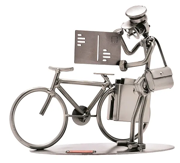Schraubenmännchen Postbote Dieser Postbote ist ein Produkt aus der Serie der Stahlfiguren von Hinz und Kunst. Er ist ein witziges Geschenk für alle Postangestellten. Optional liefern wir das Schraubenmännchen mit einem angehängten Schild, auf dem Ihr Wunschtext gedruckt wird – ideal für aufheiternde Sprüche. An dieses Aluminiumschild bringen wir mit zwei Schrauben eine Kette an, womit es an das Schraubenmännchen gehängt werden kann. Wir beschriften dieses Schild mit einem Geburtstagsgruß, einem Glückwunschtext zur bestandenen Prüfung, einem Gratulationstext zur Hochzeit, mit Worten der Auszeichnung zum Jubiläum und zur Pensionierung oder mit jedem anderen Spruch Ihrer Wahl. Originale Schraubenmännchen von Hinz und Kunst Diese Schraubenmännchen, Skulpturen und Metallobjekte aus der Serie von "Hinz und Kunst" werden alle in Deutschland von einem der führenden Metall-Bildhauer gefertigt. Es gibt weder kreative noch innovative Grenzen, um aus Schrauben, Muttern und Bolzen wunderbare Karikaturen der Gesellschaft zu formen. Alle handgefertigten Kunstwerke bestehen aus Stahl und Kupfer. Sie werden zuerst gebogen und geschnitten, dann geschweißt und zu guter Letzt gebürstet und lackiert. Diese außergewöhnliche Technik verleiht den Figuren ihren besonderen Ausdruck. Bei der großen Auswahl an Figuren, Fahrzeugen und Objekten aus jeder erdenklichen Lebenslage finden Sie bestimmt ein Geschenk, welches zu der Person passt, welche Sie beschenken wollen. Jede Figur ist ein Unikat und ein Produkt handwerklicher Arbeit. Diese Geschenke kommen immer gut beim Beschenkten an und haben einen bleibenden Wert. Ob als Geburtstagsgeschenk, Geschenk zur Einweihung, Pensionierung, Eröffnung, Hochzeit oder als Geschenk für zwischendurch – mit diesen Metallobjekten liegen Sie immer richtig.