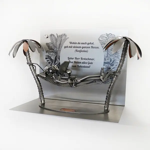 Schraubenmännchen Rentner unter Palmen in der Hängematte mit Edelstahlwandhalter Das Schraubenmännchen entspannt sich unter Palmen in der Hängematte. Die Figur wird mit Wandhalterung aus Edelstahl geliefert. Im Hintergrund ist eine schöne Urlaubslandschaft und eine persönliche Widmung graviert. Das Set zur Pensionierung besteht aus einem Schraubenmännchen in der Hängematte und einem Wandhalter aus Edelstahl. Maße des Wandhalters: Breite: 25 cm Höhe: 20 cm Tiefe: 15 cm tief Größe des Schraubenmännchens: Breite: 32 cm Höhe: 18 cm Tiefe: 10 cm Zur Befestigung werden Schrauben und Edelstahlkappen geliefert. Geben Sie einen Wunschtext an, wird das Schraubenmännchen gegen Aufpreis mit einem kleinen Schild mit Kette geliefert. Auf dem Schild ist Platz für eine persönliche Botschaft, eine Widmung, Glückwünsche oder einen passenden Spruch. Das Schildchen mit Kette kann an die Figur gehängt werden. Das Schild ist ca. 9 x 6 cm groß.
