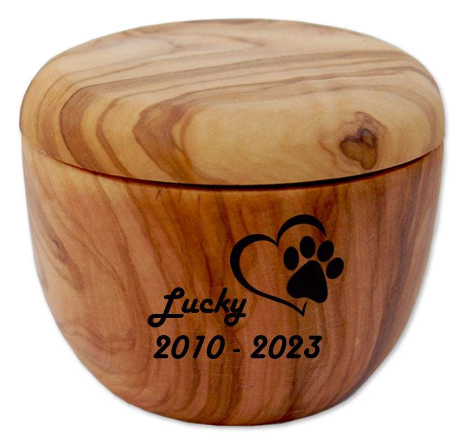 Kleine Tierurne aus Olivenholz – ein liebevoller Ort für die Erinnerung an ein kleines Leben Auch die kleinsten Begleiter hinterlassen große Spuren in unseren Herzen. Diese handgefertigte Kleinurne aus Olivenholz bietet einen würdevollen Platz für die letzte Ruhe kleiner Haustiere – etwa für Mäuse, Hamster oder Vögel – und bewahrt ihre Erinnerung in liebevoller Natürlichkeit. Gefertigt aus 100 % naturbelassenem Olivenholz steht jede Urne für Nachhaltigkeit, Ruhe und Respekt. Das Holz stammt aus nachhaltiger Forstwirtschaft und wird ausschließlich mit natürlichem Olivenöl behandelt – ganz ohne künstliche Zusätze. So entsteht eine Tierurne aus Holz, die sich harmonisch in jedes Zuhause oder eine naturnahe Abschiednahme einfügt. Mit ihren kompakten Maßen von Ø 9 cm und einer Höhe von 8 cm eignet sich die Urne für Tiere mit einem Lebendgewicht bis ca. 1 kg. Durch ihre zarte Größe und natürliche Maserung wird sie zu einem besonderen Erinnerungsstück – jedes Exemplar ist ein Unikat. Produktdetails: Material: 100 % naturbelassenes Olivenholz Oberfläche: mit natürlichem Olivenöl behandelt Maße: Ø ca. 9 cm, Höhe ca. 8 cm Volumen: geeignet für Tiere bis ca. 1 kg Beispieltiere: Maus, Hamster, Wellensittich Einsatz: für Innenräume oder naturnahe Bestattung geeignet Diese kleine Haustierurne ist mehr als ein Erinnerungsstück – sie ist ein Symbol für Dankbarkeit, Liebe und den respektvollen Abschied von einem kleinen, aber unvergesslichen Leben.