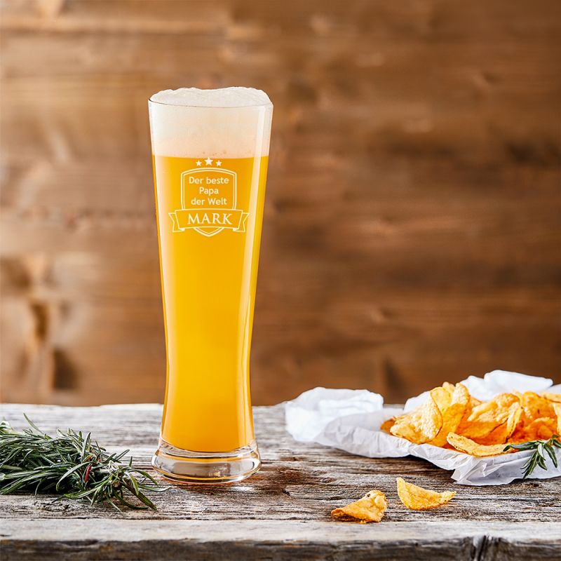 Ein Weizen in Ehren… Unser Weizenglas mit Gravur – Motiv Schild ist ein Weizenglas, wie es Papas lieben. Nicht nur lässt sich ganz wunderbar Weizen daraus trinken – das Schildmotiv, die Widmung „Der beste Papa der Welt“ und vor allem die persönliche Namensgravur machen das edle Weizenbierglas zu einem echten Unikat. Aber für den besten Papa ist das beste auch gerade gut genug.