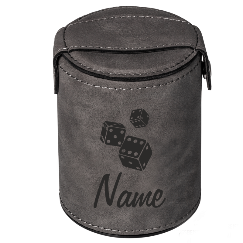 Würfelbecher aus Kunstleder Dieser hochwertige Würfelbecher mit fünf Würfeln und einem verschließbarem Würfelfach ist ein wunderbares Geschenk. Ideal für den Spielspaß auf Reisen oder Daheim. Der Würfelbecher besteht aus Kunstleder und wurde hochwertig verarbeitet. Die dargestellten Würfel (Motiv) sind fester Bestandteil des Produkts und werden mitgraviert. Deinen Wunschnamen gravieren zentriert unterhalb des Motives. So wird der Würfelbecher zum originellen Geschenk und Hingucker auf dem nächsten Spieleabend. Viel Spaß beim bestellen: Material: Kunstleder, Kunststoff Maße: 104 x 78.5 x 75 mm Gravur: schwarz Farbe: grau/braun