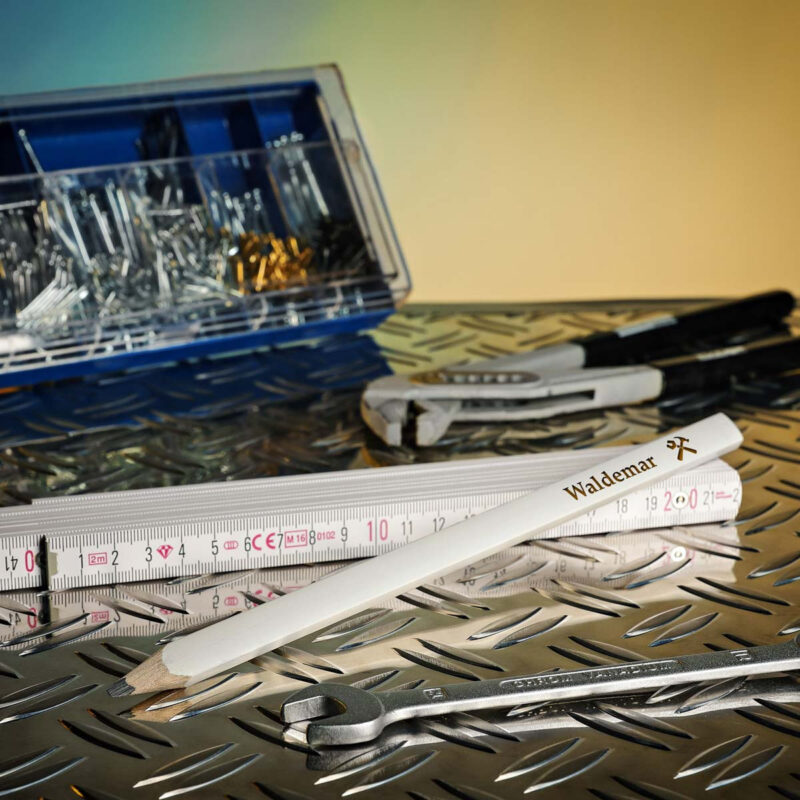 Dieser praktische Zimmermannsbleistift eignet sich besonders gut zum Beschreiben und Markieren von rauen und festen Oberflächen wie Stein, Trockenbauwänden und Platten . Zu etwas ganz Persönlichem wird der Bleistift durch die individuelle Gravur und bietet sich damit auch ideal als Geschenk für wahre Handwerker an. Die personalisierten Motive werden durch modernste Lasergravurtechnik auf das Material gebracht. Diese Gravurart ist im Vergleich zu anderen Veredelungsarten besonders dauerhaft un…